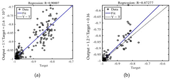 Figure 6a,b show the training and testing data regression plots, respectively. Seventy-five percent (22.5 years from 1983 to 2006) of the data was set aside for training and twenty-five percent for testing (7.5 years from 2006 to 2020). The system’s output was checked to see if it met the given target. If this was not the case, a new network design or learning approach was introduced to improve the learning method. The R-values of 0.90 during training and 0.87 during testing indicated that the forecasting model had outstanding generalization performance due to its ability to predict the testing data reasonably.