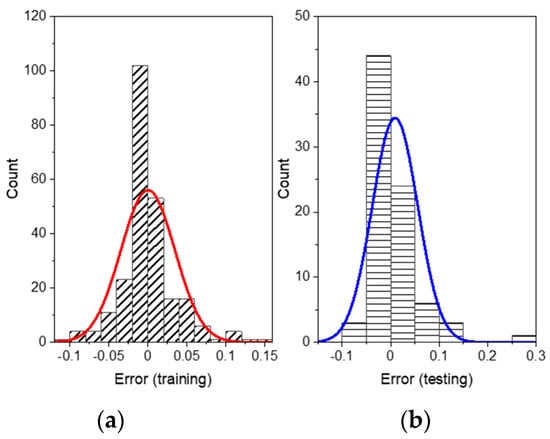 The error distribution is shown in Figure 7. It was found that the peak of the normal distribution curve was very close to zero in both training and testing data sets.