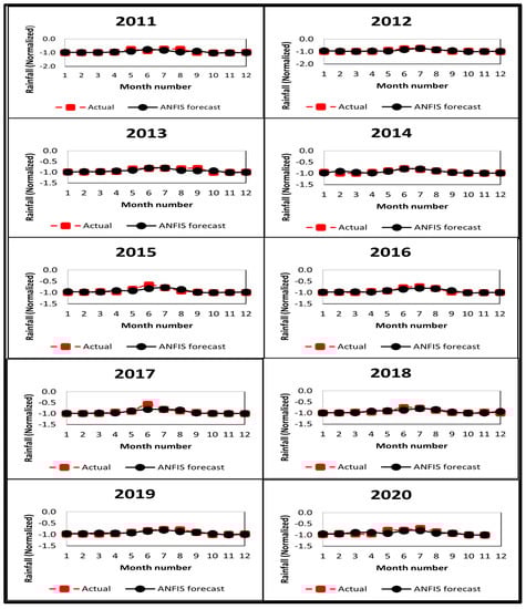 The developed model was used to forecast rainfalls over the period from 2011 to 2020 and the outcomes were compared with the actual data as shown in Figure 8. The computed data appear to be in good agreement with the actual ones.