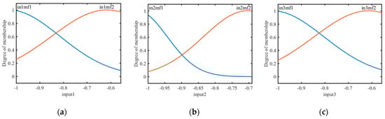 where Ii MFj corresponds to ith input and jth MF. The Gaussian membership function was represented by the following equation (Equation (13)):