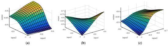 A degree of membership function in the y-axis represents the degree to which a given input belongs to a particular set or category, typically represented as a value between 0 and 1. In fuzzy logic and fuzzy set theory, a degree of membership function is used to define the membership of an element in a set. It is often represented as a curve or a graph, with the x-axis representing the input and the y-axis representing the degree of membership. The variations in the MFs for each input parameter are shown in Figure 9a–c. A surface plot in fuzzy logic is a three-dimensional representation of a fuzzy set or a membership function. It is used to visualize the degree of membership of an input point in a fuzzy set, with the x- and y-axes representing the input variables and the z-axis the degree of membership.