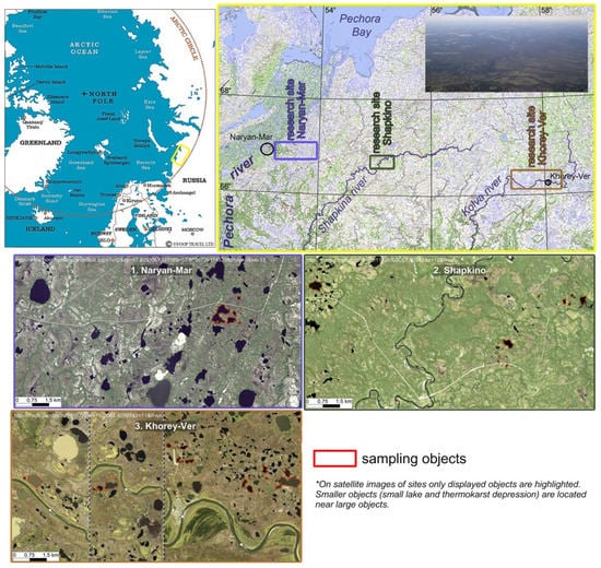 The field work was carried out in July–August 2016. The studied water bodies were located beyond the Arctic circle on the territory of the Bolshezemelskaya Tundra (67°43′–67°86′ N, 53°89′–58°86′ E). Figure 1 shows a map of the research area. A total of 29 lakes were studied. The studied lakes were located on three sites in the zone of discontinuous permafrost distribution: the upper course of the Pechora river (Naryan-Mar district; n = 6 lakes) and the catchment basins of the Shapkina rivers (the district of the Halmermusyur ridge and the Big Salindey-musyur, Vesnimusyur, Shapkina-musyur hills; n = 7 lakes) and Kolva (the average flow of the river below and above the village of Khorey-Ver; n = 16 lakes). These sites differed in the density of the hydrographic network, hypsometric and orographic position of the lake basins. The maximum number of lakes per unit area is observed on the site of Khorey-Ver, and the minimum is on the site of Shapkino. The depth of the lakes ranged from 0.5 to 1.5 m and, normally, these lakes freeze solid in winter.