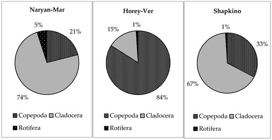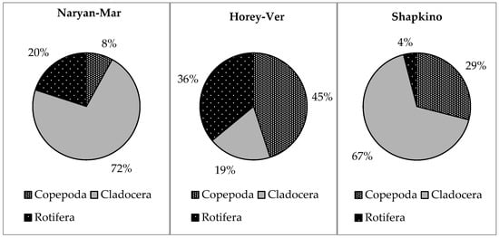 High zooplankton abundance numbers are typical for lakes located in the Kolva River catchment area (Khorey-Ver district). Copepods dominated the zooplankton population in terms of abundance and biomass. The highest biomass was recorded in the lakes of the Shapkina river catchment area, which is associated with the maximum values of the average individual mass of hydrobionts (Table 2). The main contribution to the total biomass and abundance of zooplankton in this area was made by cladocerans (74% of the total biomass and 72% of the total abundance). For lakes located in the Naryan-Mar district, the leading role of cladocerae in the formation of quantitative indicators of zooplankton (71% of the total biomass and 73% of the total abundance) was noted (Figure 2 and Figure 3). Lakes in the catchments of the Kolva and Pechora rivers were characterized by an increase in the share of rotifers (20–23% of the total abundance; Figure 2, Table 2), which can indicate eutrophication. It is known that an increase in the ratio of the abundance of Cladocera and Copepoda (Nclad/Ncop) and a decrease in the average individual body weight of zooplankton indicate an increase in the trophic level of reservoirs [40].