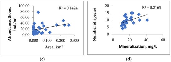 The mineralization of lake water affected the level of quantitative development of cladocerae and rotifers. For Cladocera, positive relationships (p < 0.05) between the quantitative zooplankton characteristics (total abundance and total biomass) and mineralization were observed (r = 0.65 and 0.70, respectively), while the number of Rotifera had a moderate negative relationship with mineralization (r = −0.34, p < 0.05). A positive significant relationship between water mineralization and the number of species in lakes was also observed (r = 0.45, p < 0.05) (Table 3, Figure 4).