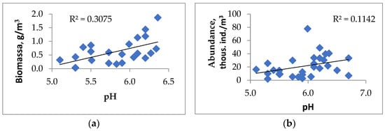 The revealed correlation between total abundance and total biomass of zooplankton and pH was positive and significant (Table 3, Figure 4). A positive relationship between plankton abundance and lake water pH is well expressed for the dominant Cladocera species (D. middendorffiana, B. longispina) and negative for K. longispina (Table 4).