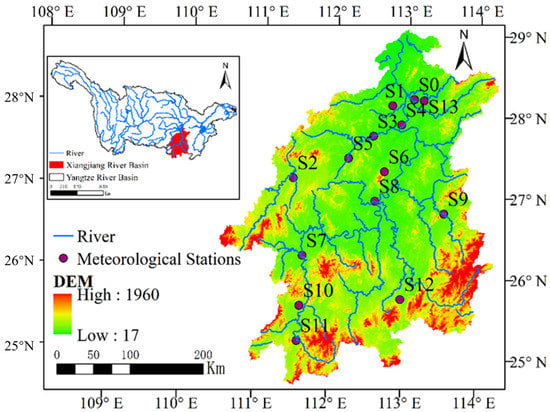 The Xiangjiang River, a tributary of the Yangtze River, is also the river with the widest basin area in the Dongting Lake system (Figure 1). The total length of the Xiangjiang River from its source to the Haohe Estuary is 856 km, with a watershed area of 94,300 km², 85,383 km² of which is in Hunan Province, accounting for 90% of the total basin and about 40% of the total area of Hunan Province [].