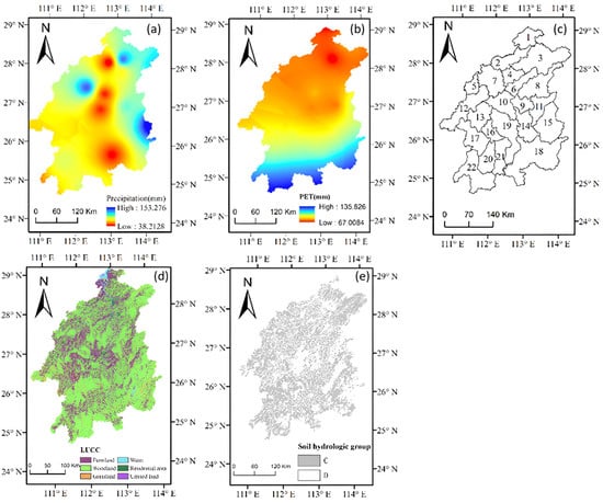 (a) Rainfall for January 2006. (b) Potential evapotranspiration for January 2006. (c) Sub-watershed. (d) Land-use map of the XRB in 2006. (e) Grouping charts for hydrological soils.