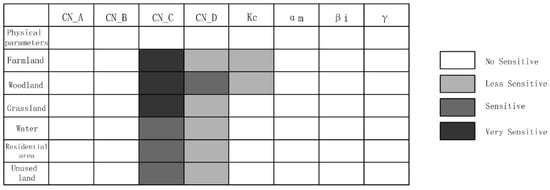 It can be seen from Figure 3 that the CN_C values for farmland, woodland and grassland are highly sensitive parameters of the model. The CN_C values for water, construction land, unused land and the CN_D of woodland are the medially sensitive parameters of the model. The CN_D values for construction land, unused land, farmland, grassland and water and the Kc values for farmland and woodland are non-sensitive parameters of the model.