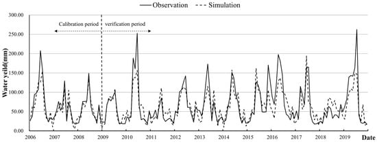 We selected 2006–2009 as the calibration period and 2010–2020 as the validation period. Figure 4 shows the simulated water-yield results for the XRB. The simulated results and the actual data showed a high degree of fit.