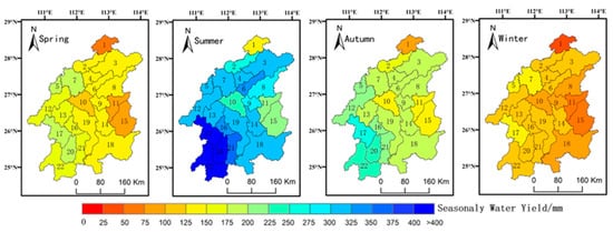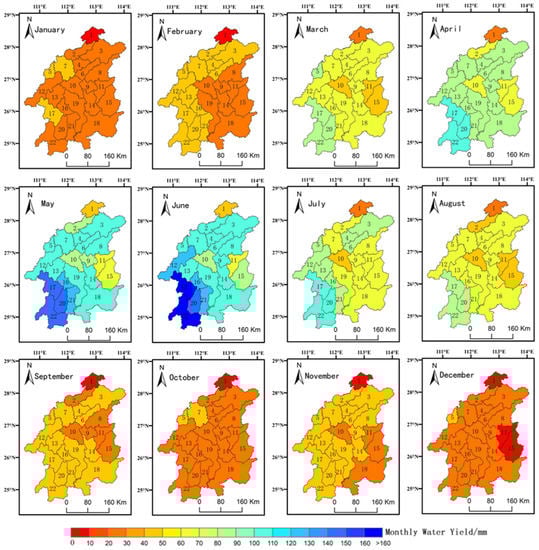 The spatial variation characteristics of the multi-year monthly average water yield and the spatial variation characteristics of the multi-year quarterly average water yield are shown in Figure 5 and Figure 6, in which the monthly and quarterly water yields are the average values for the study period (2006–2020). On the monthly scale, the characteristics of the average monthly water yields for many years are as follows: the water yield from January to June presents a gradual upward trend, while there is a shift to a downward trend from June to October, which rises again slightly from October to November and then converts to a decreasing trend from November to December. On the seasonal scale, the annual average seasonal water yield is characterized by a gradual increase from spring to summer and a gradual decrease from summer to winter. In general, the spatial variation in water production showed an increasing trend from northeast to southwest. The northern watershed 1, the central watershed 10, and the eastern watersheds 11 and 15 are areas with low water yields, and the southwestern watersheds 17, 20 and 22 are areas with high water yields.