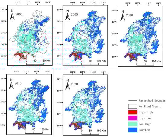 It can be seen from Figure 7 that, from 2006 to 2020, the XRB was dominated by low–high aggregation sub-basins and low–low aggregation sub-basins. The low–high aggregation sub-basins were mainly distributed in the central, western and southern areas, including watersheds 5, 6, 10, 12, 13, 16, 17, 18, 14, 19, 20 and 21, while the low–low aggregation sub-basins were the most widely distributed, including watersheds 1, 2, 3, 4, 7, 8, 11, 14, 15, 18, 12 and 22. The high–high aggregation sub-basins were less widely distributed and were concentrated in basin 22 in the southern area of the XRB. In general, from 2006 to 2020, basins 1, 2 and 3 in the north and basins 8, 9, 11, 15 and 18 in the east were the main distribution areas of the low–low aggregation sub-basins, that is, the areas with low water-yield values. Basin 22 in the south of the XRB was the main distribution area of the high–high aggregation sub-basin, that is, the high-value area.