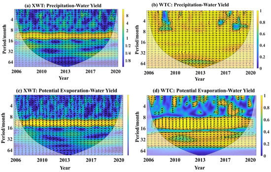Figure 8 shows the cross-wavelet results for monthly rainfall, potential evapotranspiration and water yield. There was a resonance period of 10–15 months between rainfall and water yield from 2006 to 2019. The phase difference arrows of the two were horizontal to the right, indicating that they were positively correlated. Potential evapotranspiration and water yield also had a resonance period of 10–15 months from 2006 to 2019, and the phase difference arrow between the two also reflected that the change in potential evapotranspiration was 3 to 4.5 months earlier than that for water yield. In the low-energy region, potential evapotranspiration and water yield had 8–16- and 18–48-month cycles between 2004 and 2016, in addition to intermittent oscillations of 1–8 months, with the phase difference arrow horizontal to the left, indicating that they were negatively correlated.