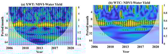 Figure 9 shows the cross-wavelet results for monthly normalized vegetation index (NDVI) and water yield. During 2006 to 2009, there was a resonance period of 8–14 months between NDVI and water yield, and during 2012 to 2018, there was a resonance period of 12–15 months. The phase difference arrow direction in the figure indicates that the change in NDVI was 3 months ahead of the change in water yield. In the low-energy region, NDVI and water yield showed intermittent fluctuations of 8–16 months and small-scale intermittent fluctuations of 1–4 months. The arrow direction of phase difference between the two shows that the change in NDVI occurred 3 months earlier than the change in water yield and that they were positively correlated.