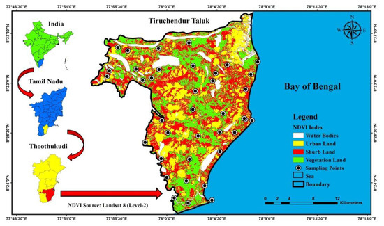 The study area covers an area of 8°22′ N–8°40′ N latitude and 77°14′ E–78°46′ E longitude in Tiruchendur Taluk of Tuticorin district with an area of 470 km2 in Tamilnadu, India. Figure 1 shows the NDVI index of the region expressing water, land, shrub, and vegetation covers in Tiruchendur Taluk. Around the NW–NE, the year-round surface water source of the Thamiraparani River drains into the Bay of Bengal near the Punnakayal area, and the seasonal water source of the Karamaniyar Canal drains along the southern part of Tiruchendur. Selvam et al. [27] pointed out that the average rainfall in Tamil Nadu during the northeast monsoon is 94.3 cm, while the average rainfall in the study area is 87.7 cm, which is very low compared to the rainfall in Tamil Nadu. Wind speeds of 36 to 60 km/h were recorded during the months of June to September, while 20 to 40 km/h were observed during the months of October to December [28]. Tiruchendur Taluk is one of the major agricultural areas of Thoothukudi, and the major crops are cassava, coconut, banana, mango, cashew, sugarcane, cloves, cardamom, pepper, etc., and palm products are mainly grown in the study area [19]. In India, after Gujarat, the coastal areas of Tamilnadu around Thoothukudi and Tiruchendur are also heavily involved in the sea salt industry [28]. Most of the surveyed areas are surrounded by agricultural land, with the exception of wastelands, salt pans, and water bodies [20,24]. Groundwater and surface water in the region are affected by anthropological activities related to fishing, tourism, and industries [23].