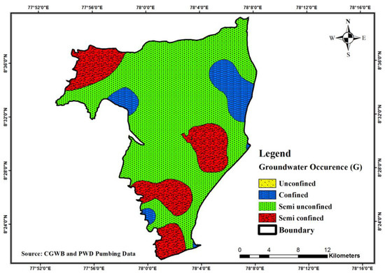 Parameter (G) refers to the types of aquifers that function as aquifers at a given depth in the study area. For this study, groundwater event data were collected from pumping test data and water level mapping reports from the CGWB and PWD departments. The IDW-based spatial map of aquatic media identifies four types of aquifers: confined (10%), unconfined (5%), semi-unconfined (70%), and semi-confined (15%) (Figure 2). Therefore, shallow bodies of water, primarily in coastal and riverine plains, have been used to extract groundwater for drinking and irrigation purposes.