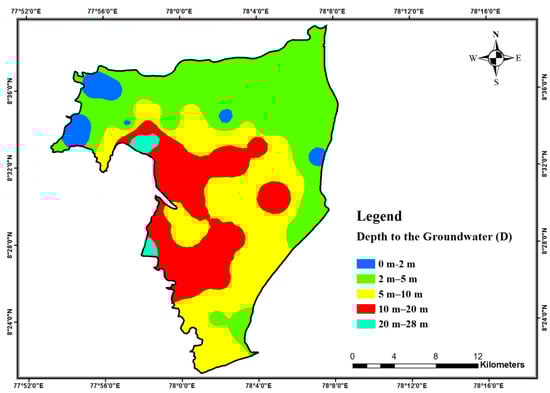 The depth to groundwater regulates the risk of contamination as it relates to the thickness of the subsurface material. The depth to the groundwater determines the risk of contamination as it relates to the thickness of the subsurface material that must be traversed by the infiltrated water before it reaches the groundwater saturation zone. Particularly in coastal areas, the depth from the ground surface to the water level affects groundwater contamination because groundwater contamination increases with decreasing depth [34]. In the present study, this parameter was determined using 39 groundwater samples collected from open wells and drilled wells at depths ranging from 1 to 28 mbgl (Figure 4). The shallow depth of the water level (0–2 mbgl) was observed along the coast, and the deep groundwater level (20–28 mbgl) was observed beyond the coastline in the study area.