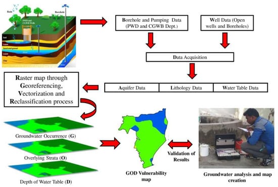 There are different types of vulnerability systems to determine the vulnerability of groundwater in groundwater quality assessment, e.g., SINTACS [9], DRASTIC [10], SI [11], and GOD [12]. Among the mentioned methods, GOD was selected for this study as it is the easiest to evaluate and interpret based on the hydrogeological parameters of GOD, and all of these parameters had already been measured by the regional government and a private water authority, so we can ensure the accuracy and the quality of the data. There is a lot of background research on groundwater vulnerability indices using the GOD method, especially the studies of Akinlalu et al., in Nigeria [13]; Boufekane & Saighi, [14] and Kerzabi et al., [15] in Algeria; Lisboa et al., in Brazil [16]; and Islam et al., in Bangladesh [17]. Groundwater vulnerability is defined as the process of calculating the potential for contaminants to occur in a given event [18]. GOD [12] is an evaluation method to assess the vulnerability to various hydrogeological parameters such as G—the aquifer, O—the overlying lithology of the aquifer, and D—the depth of the water table. The result of the method for each classification varies from minimum vulnerability (zero) to maximum vulnerability (one) in the groundwater quality study.