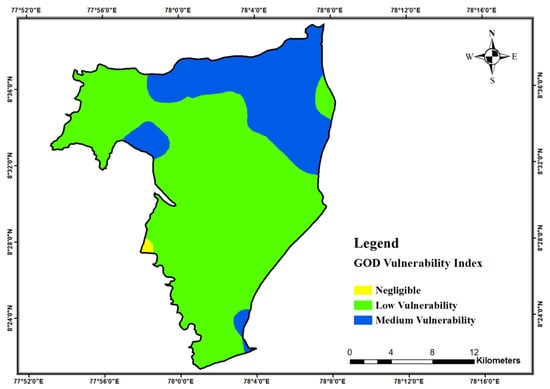 Tamil Nadu has a high population density and is a coastal area, and nearly 90% of the people in Thoothukudi rely on groundwater as their main source of drinking water. This study focuses on groundwater contamination and helps to classify the Tiruchendur Taluk of Thoothukudi district based on its vulnerability studies. Many researchers have adapted various works to assess water quality using the WHO (World Health Organization) and Bureau of Indian Standards-based classification, irrigation codes, water quality index for drinking water and irrigation, health risk index, lake water mixing code, correlation methods, etc. [19,20,21,22,23,24,25,26]. However, this study is a new approach to identify the groundwater vulnerability zones in the coastal aquifers of Tiruchendur Taluk in Thoothukudi district using the GIS-based GOD method. The predicting groundwater vulnerability map can be further utilized as a base map for management of groundwater and its restoration of groundwater quality.