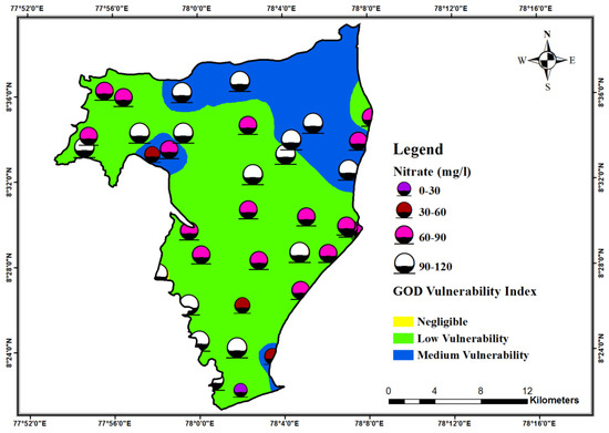 Spatial distribution of the GOD intrinsic vulnerability with an NO3- concentration.