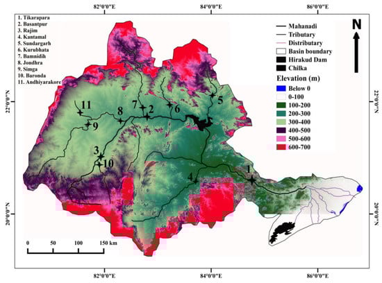 The elevation map of the Mahanadi River basin with the geographical location of 11 gauging stations [48].