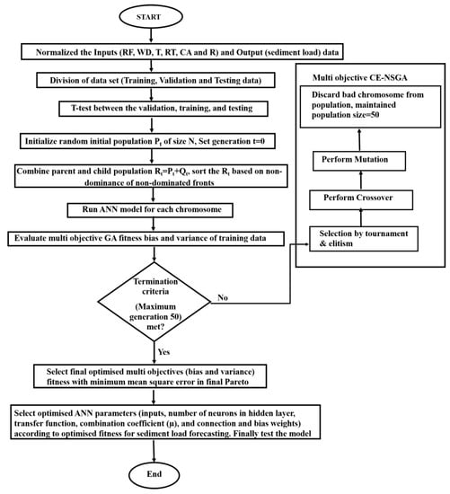 The ANN model parameters are optimized using GA by optimizing a single objective, namely Mean Square Error (MSE), as a criterion for the evaluation of performance, which is found in various studies [29,30]. Furthermore, the performance of feed-forward back-propagation ANN is also determined by achieving the lowest possible MSE [31]. The drawbacks of using a single objective (MSE) for the optimization of parameters of ANN have been well documented in past research [31,32]. The MSE is a summation of error variance and squared mean error (bias). MSE minimization does not guarantee that both error variance and bias are minimized. There is a conflict between bias (mean error) and variance, both of which affect ANN performance (MSE) [32]. In influencing MSE of estimation or forecasting, bias and variance contradict each other, resulting in significant uncertainty in evaluation. If one of them is reduced, then the other is increased [33]. Thus, the model selection issue can be viewed as a multi-objective optimization issue. As a result, minimizing both components is critical for attending generalization to avoid overfitting or underfitting with greater accuracy. Underfitting is caused by bias, whereas overfitting is caused by variance, which limits the model’s generalization ability and contributes to its poor performance [31]. The optimization and compromise of bias and variance multi-objectives result in a reliable and accurate model [34,35]. The GA is a well-suited population-based search method for problems involving multiple objectives [19,36]. The Non-Dominated Sorting GA (NSGA), Controlled Elitist GA (CEGA), and Elitist Non-Dominated Sorting GA (NSGA-II) are more familiar with GA-based multi-objective algorithms [37]. Controlled Elitist Gas are more capable of maintaining population diversity for getting to the best Pareto front by controlling the number of elites than NSGA-II and NSGA [35]. Therefore, the Controlled Elitist MOGA-based ANN model has been used to optimize these two contradicting responses (variance and bias). Recently, many works of literature are available in various fields for prediction and forecasting using multi-objective optimization for ANN and it was found that the system’s accuracy could be increased using this hybrid approach [38,39,40]. Rosales-Pérez [33] applied multi-objective GA for the optimization of AI models such as Support Vector Machine (SVM) parameters by optimizing bias and variance. Recently, there are few studies that have been conducted on the multi-objective optimization-based model to estimate the sediment load or suspended sediment concentration [41,42].