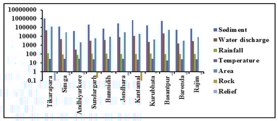 Spatial variation of monthly average hydro-climatic and geomorphological data such as water discharge (cms) (m3/s), temperature (°C), rainfall (mm) and sediment load (t/ month), relief (m), and catchment area (km2).