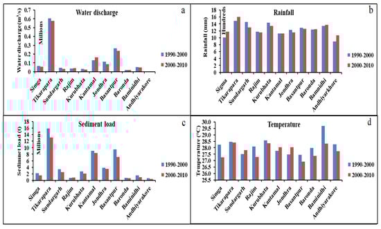 There were significant temporal as well as spatial variations in the SL. Variations of monthly average WD, RF, T, and SL data over 20 years with spatial variation (R, RT, and CA) of each gauge station in the logarithm scale are shown in Figure 3. Due to huge variations in the dataset, we have followed the logarithm scale so that maximum data values are shown in Figure 3. It is seen in Figure 3 that the pattern of decrease in WDs and corresponding sediment load is the same sediment load, except for Kantamal station. Further, Tikarapara station indicates the highest WD, CA, R, RF, and SL, whereas Andhiyarakore station shows the lowest values of it. Furthermore, it has been noted that SL changes proportionally with WD, with the Tikarapara gauge station recording the highest values due to the highest WD amongst all gauge stations. The highest CA is also observed at this gauge station. Lowest R is found at the Bamnidih. The lowest rock value is found at Kantamal. Variations in RF, WD, T, and SL during the decades of 1990–2000 and 2000–2010 at different locations such as upstream, midstream, and downstream in the MR are given in Figure 4. The highest decrement in sediment yield is found at Tikarapara station among all stations. This may have been caused by the SL trap at the Hirakud dam, which is upstream of the Tikarapara. Higher amount of SL is also decreased at Basantpur gauging, which may be due to traping of SL at large Minimata Bango dam nearest to this station.