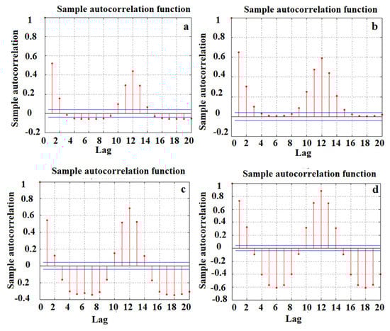 The autocorrelation function (ACF) for monthly hydro-climatical data (a) SL, (b) WD, (c) RF, (d) T.