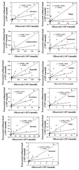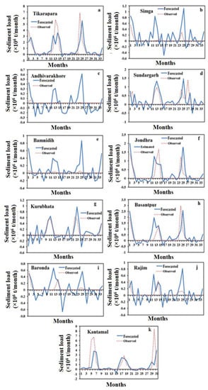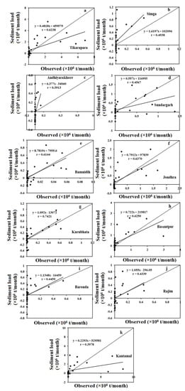 Figure 7 and Figure 8 illustrate the ANN-MOGA-51 model’s hydrologic graph and scatter plot, respectively. The hydrologic graph revealed that, except for the Kantamal, Andhiyarakore, Simga, and Bamnidih stations, the predicted SL corresponds to the observed SL data’s variability. Andhiyarakhore is a small tributary that has a relatively small CA; however, despite its size, it carries a relatively small SL. The reason for this is that relatively small CA basins are unable to store SL and allow for the complete removal of all material that has been eroded. The presence of a large dam named Minimata Bango at Bamnidih is the primary factor that contributes to the modeled output not being accurate. Although Simga has a topography that is almost entirely composed of limestone and a relatively large catchment area, the area is relatively flat. Because of this, the sediment yield and water discharge are relatively low in comparison to those of other tributaries, such as Seonath and Tel, which have a smaller catchment area. Further, its complex non-linear erosion and transportation process of sedimentation resulted in the poor performance of the proposed model at some gauging stations. The high skewness, Kurtosis, coefficient of variation (COV) and maximum/mean value of suspended sediment load indicate its complex and highly erratic behaviours as compared to other variables (water discharge, rainfall and temperature). Thus, estimation of suspended sediment load through mathematical models is very difficult comparative to other variables [24]. The highest coefficient of variation of rainfall is found at Kantamal. This could also explain the corresponding water discharge and the SL dataset’s wide variation and non-normal distribution. Similarly, the ANN-MOGA-51 results are nearer to the bisector line which is also known as the 45 ° line, except for the four gauging stations that were mentioned earlier (Figure 8). The scatter plots and hydrographs show that the magnitudes and medium, high, and low SL forecasted values generated by the best ANN-MOGA-51 forecasting model are also fairly close to the corresponding actual SL values. The ANN-MOGA-51 model displayed a positive value SL at each of the 11 gauge stations, although the SL output was either 0 or very near zero (Figure 7 and Figure 8). Based on these findings, it was determined that the application of ANN in conjunction with GA is the method that yields the most accurate results for calculating SL in the MR basin system. The forecasting model provides the highest level of accuracy at the Tikarapara gauging station compared to any other station gauging station. This may be due to the location of Tikarapara, which is at the most downstream portion of the MR basin and possesses the highest WD, CA, RF, and SL of any of the gauging stations [24,47].