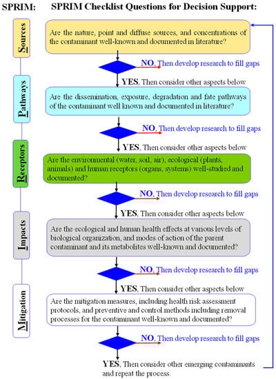 Figure 2 depicts how the SPRIM continuum concept can be used to develop a checklist of questions for use as a decision-support tool for framing research on emerging contaminants. For example, given an emerging contaminant of interest, the SPRIM continuum framework can be used to evaluate the evidence to determine the most-studied and poorly understood aspects. Then, the under-studied aspects are used as a basis to develop and frame future research, thus avoiding duplicating previous research efforts. Using the SPRIM continuum to determine what aspects of emerging contaminants are well-studied versus those that are poorly understood constitutes the decision-support application of the framework. If all aspects of the SPRIM continuum for a given emerging contaminant are well-known, this then justifies the need to identify other emerging contaminants. Once another emerging contaminant of potential investigation has been identified, the process is repeated, starting with the evaluation of evidence with respect to the sources of the emerging contaminant (Figure 2). Relative to the current ad hoc approach to research on emerging contaminants, the SPRIM continuum framework has the merits summarized below.
