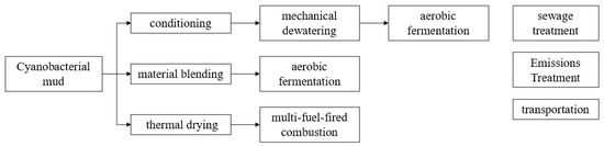 Researchers have completed a lot of work on the treatment and comprehensive utilization of cyanobacteria. Aerobic fermentation, anaerobic fermentation, incineration for power generation, and the extraction of active substances are effective ways to harmlessly recycle cyanobacteria, and these methods realize the regeneration and utilization of resources [19,20,21]. However, some methods still have problems, such as high costs, and there are only a few engineering applications, which makes it difficult to use them in practical applications. In recent years, the typical ways to achieve cyanobacteria recycling in China have been incineration for power generation and aerobic fermentation [22,23].
