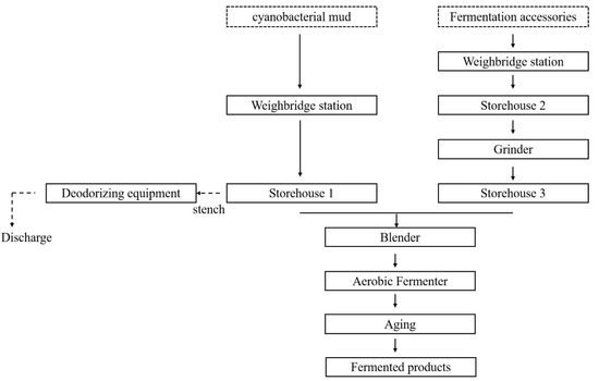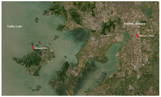 The cyanobacteria used in this study are from initially de-watered cyanobacterial mud obtained from the waters near Zhangjia Bay (31°08′55.9″ N, 120°16′9.3″ E) in Taihu Lake, and the fermentation process was conducted at the plant for the resource utilization of cyanobacteria (31°11′25.8″ N, 20°39′27.0″ E), which is about 50 km away from Zhangjia Bay. Influenced by the prevailing summer monsoon, many cyanobacteria are trapped by the emergent plants in the nearshore areas that have extremely large cyanobacteria accumulations [26], which has frequently occurred Taihu Lake since the 1990s. And the location is indicated in Figure 2. To obtain cyanobacteria for fermentation experiments, from May to September 2022, the cyanobacteria were continuously collected using ships and a nearshore cyanobacteria pipeline that is 15 cm below the water surface on the shore of Zhangjia Bay. Then, the salvaged cyanobacteria were initially mechanically de-watered in the algae water separation station, and then transported to the aerobic fermentation plant.