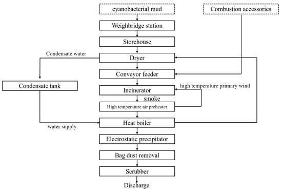 In the past few decades, human productive activities have caused an increase in the amount of exogenous nutrients in lakes, resulting in these lakes’ eutrophication and Cyanophyta bloom. Among them, the outbreak of cyanobacteria in lakes threatens the survival of aquatic animals [1,2,3], and it even poses risks to humans [4,5]. In addition, the rapid growth of cyanobacteria results in a significant increase in the amount of dissolved organic carbon in water [6,7], which in turn leads to the deposition of organic carbon, and finally, influences global carbon cycling and climate change [8,9,10]. Taking Taihu Lake, Chaohu Lake, and the Dian Lake as examples, the salvage of Cyanophyta water exceeded 8 million tons in 2020 [11,12]. The salvage, dehydration, landfill, treatment, and disposal of algal water will lead to different amounts of carbon emissions. Currently, there is no papers focusing on calculating the carbon emissions of the cyanobacterial recycling process. Aerobic fermentation is a typical process for cyanobacterial treatment, and this paper calculates the amount of carbon emission based on the engineering example of cyanobacteria treated in the aerobic fermentation process. In addition, the carbon emissions in the dry incineration process are also compared to realize carbon identification and the carbon assessment of each disposal process.