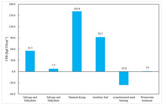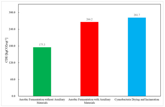As shown in Figure 6, from the perspective of net emission, the dry incineration process possesses the highest carbon dioxide equivalent (CDE for short) among the three treatment processes, reaching 281.7 kg CO2·t−1. The amount of carbon dioxide emissions caused by the aerobic fermentation process is the lowest: it is only 175.3 kg CO2·t−1. Among the three treatment processes, since the auxiliary materials contain a large amount of volatile organic carbon, the organic carbon in the aerobic fermentation process produces the unorganized escape of CH4 and N2O, so the amount of carbon emissions of the aerobic fermentation process with auxiliary materials is greater than that of the aerobic fermentation process without auxiliary materials. Cyanobacterial mud’s drying and incineration process require thermal drying, which consumes a large amount of heat and fossil energy auxiliary fuel during the incineration process, leading to lots of carbon being emitted.