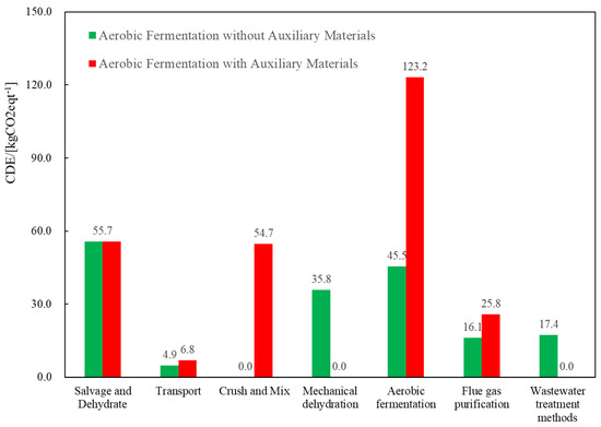 According to Figure 7, the following results can be obtained from the analysis. Using the same collection procedure of cyanobacterial mud, the advantage of carbon emission reduction using aerobic fermentation technology without auxiliary materials is more evident than that of aerobic fermentation technology with auxiliary materials in treating the unit weight of cyanobacterial mud. In aerobic fermentation without excipients, there is no need to transport the fermentation excipients with a low moisture content. The fuel carbon emission caused by the transportation of excipients is reduced. However, the aerobic fermentation technology without excipients requires more chemicals than the aerobic fermentation with auxiliary materials does to dry and dehydrate the cyanobacteria mud, thus increasing the amount of indirect carbon emissions from the reagents, and at the same time, when the materials are pretreated in the aerobic fermentation process with auxiliary materials, they need to be entirely crushed and blended, and the power consumption is significant, and thus more carbon is indirectly emitted. During the fermentation process, auxiliary materials are decomposed into small molecules by the fermented bacteria, causing more greenhouse gas emissions. In addition, due to the limitations of the equipment and technology, the aerobic fermentation process will inevitably cause a local anaerobic environment, producing CH4 and N2O, which are non-negligible and challenging to collect. In the aerobic fermentation process with auxiliary materials, adding additional materials will produce more CH4 and N2O than those that would be created in aerobic fermentation without auxiliary materials, so each ton of cyanobacterial mud treatment will lead to more carbon emissions.
