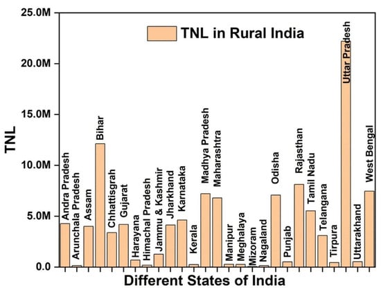 There has been a steady-state linear increase in the total population in India, which is reflected in a more than two-fold rise in the number of rural residents in the last six decades (see Figure 1, left axis). India being the world’s fifth biggest economy [14], its aggressive industrialization and development of diverse manufacturing units have led to rapid urbanization due to which there has been a consistent demographic transition of the rural population to urban centers. This can be visualized in the reduction in the percentage of the total population living in rural areas, as shown in Figure 1 on the right axis. However, the majority of people in India are still rooted in its rural locations; in 2021, 64.65% of its people consisted of masses living in villages [13,15]. Their lifestyle is simplistic, and they are highly dependent on the environment of their locality, as their occupation is primarily agriculture, weaving, handicrafts, small-scale manufacturing units (for example, brick and tile manufacturing), etc. In order to render the modern lifestyle accessible to the rural masses and provide them with a healthier living culture, on October 02, 2014, the Government of India (GOI) launched Swachh Bharat Mission (SBM), a Clean India Mission aimed at creating excellent sanitation facilities with high hygiene and an open-defecation-free (ODF) India by 2 October 2019 [16]. Through this program, GOI has constructed 109 million individual household lavatories all across the country, resulting in providing access to latrines in all rural households. The distribution of the number of lavatories built in India across all states is depicted in Figure 2.