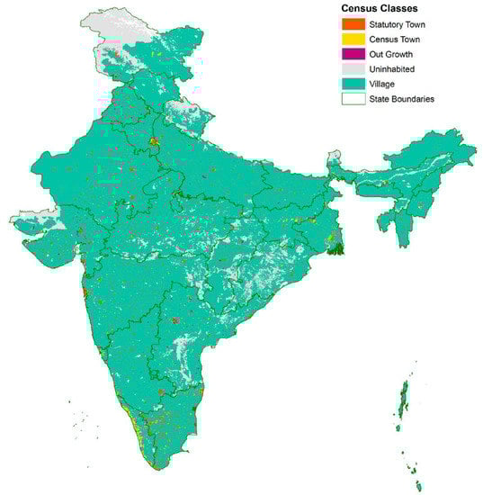 Rural and urban classifications based on the 2011 population census data of India, provided by India’s Office of the Registrar General and Census Commissioner. This figure is adapted from the work of Deborah Balk et al. [18]. Here, statutory town refers to the legally well-established urban area; census town refers legally to a rural settlement with a population greater than 5000 people [19]. An ‘outgrowth’ is a region of high population density positioned adjacent to a statutory town, which is on the verge of becoming a separate statutory town in the future [18].