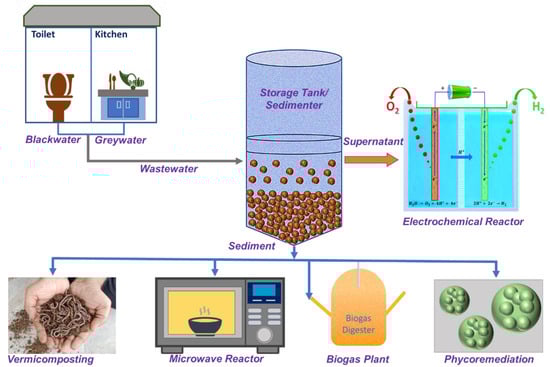 Thus, the facile segregation of nutrients and microbial contents or the direct inactivation or removal of microbes, through proper treatment techniques, provides non-potable water for reuse. Usage of such nutrients from BW eliminates the need of hazardous synthetic chemical fertilizers and reduces the cost of current agricultural practices. The BW generated from localized sources, be it single-household toilets or community-based toilets, is mechanically separated into two phases, the overflowing liquid phase (supernatant) and the sediment, a solid phase. This review article will discuss the novel methods that can treat both phases in a decentralized manner, providing water and energy sustainability in the longer run. The entire picture of this work can be visualized in Figure 4. The methods mentioned for BW treatment can also be implemented for treating GW or the mixture of both GW and BW.