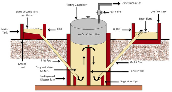 Schematic representation of the typical floating-drum biogas plant. This diagram is adapted from the work of Prachi Pandey et al. Reused under Creative Commons license [71].