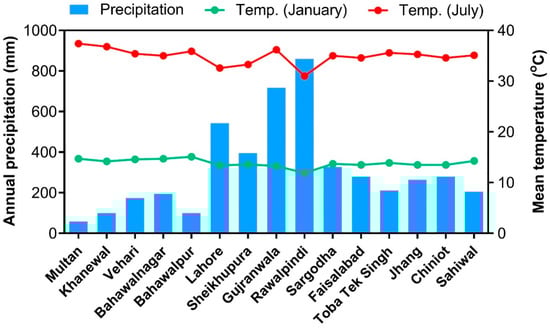 Figure 2. Total annual precipitation (whole year) and mean monthly temperature (during the sampling months of January and July) in 2018 across the 15 districts of Punjab.