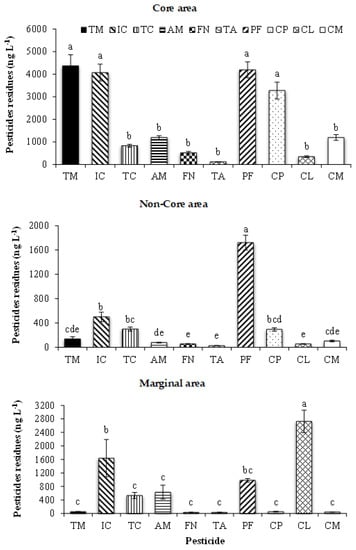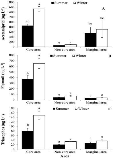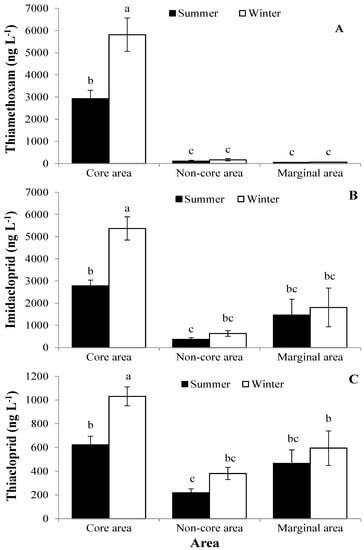 Neonicotinoids are considered neurotoxic pesticides as they cause inhibition at the presynaptic ends of neurons and nerves, thus causing various interruptions in neurotransmission and diseases. The highest residual level of thiamethoxam (5812 ng L−1) was found in core area during the winter season, followed by 2926 ng L−1 in core area during the summer season (Figure 4).