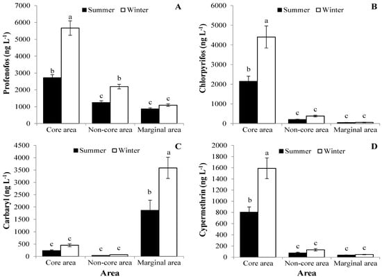 Figure 6. The quantities of (A) profenofos, (B) chlorpyrifos, (C) carbaryl, and (D) cypermethrin residues in water from different regions of Punjab during the summer and winter seasons. Bars represent means ± standard errors. Bars sharing the same letters in each chart do not differ significantly.