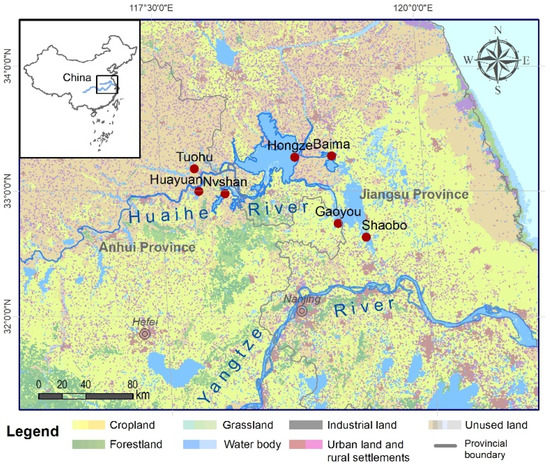 The location of Huaihe River and seven sampling lakes.
