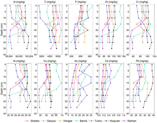 For the surface sediments (the top 0–1 cm), the highest concentrations of As (33.4 mg/kg), Cd (0.89 mg/kg), Cu (61.5 mg/kg), P (997.0 mg/kg) and Zn (162.5 mg/kg) were measured in Lake Baima, while the highest concentrations of Al (92.4 mg/g), Cr (101.1 mg/kg), Ni (50.6 mg/kg) and Pb (43.2 mg/kg) were measured in Lake Huayuan and the highest concentration of Ti (5.2 mg/g) was measured in Lake Gaoyou. By contrast, the lowest concentrations of Al (61.6 mg/g), Cr (69.4 mg/kg), Cu (28.8 mg/kg), Ni (34.9 mg/kg), Pb (26.3 mg/kg), Ti (2.7 mg/g) and Zn (76.0 mg/kg) were measured in Lake Tuohu, while the lowest concentrations of As (14.9 mg/kg), Cd (0.17 mg/kg) and P (603.6 mg/kg) were measured in Lake Gaoyou, Lake Nüshan and Lake Huayuan, respectively.