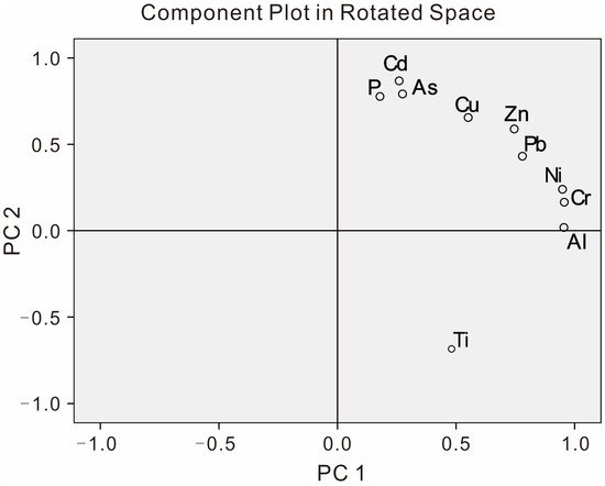 The results of Kaiser–Meyer–Olkin measure of sampling adequacy (0.71) and Bartlett’s test of sphericity (χ2 = 755.4, p < 0.001) suggest that the element composition of the lacustrine sediments from the MLRHR is suitable for PCA. The results show that the first two principal components (PCs) explain 81.0% of the total variance. The first PC represents 46.0% of the total variance, and is characterized by large positive loadings of Al (0.96), Cr (0.96) and Ni (0.95) concentration, and moderate loadings of Pb (0.78), Zn (0.75), Cu (0.55) and Ti (0.48) concentration (Figure 3). The second PC explains 35.0% of the total variance, and is mainly dominated by Cd (0.87) and As (0.79), as well as moderate loadings of P (0.78), Ti (−0.68), Cu (0.66), Zn (0.59) and Pb (0.43).