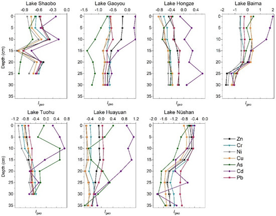 All Igeo values of Cr and Ni are below 0, and all Igeo values of As, Cu, Pb and Zn are below 1, indicating that the sediments are unpolluted or slightly polluted by these PHTEs (Figure 5). Among them, Igeo values of Cu and Zn between 0 and 1 only occur in the upper sediments from Lake Baima, and Igeo value of Pb between 0 and 1 only occur in the upper sediments from Lake Huayuan. Igeo values of As between 0 and 1 are found in the sediments from Lake Baima, Lake Huayuan and Lake Tuohu. For Igeo values of Cd, moderate Cd pollution occurs in Lake Baima and Lake Huayuan, slight pollution occurs in Lake Gaoyou, Lake Hongze and Lake Tuohu, while there is no Cd pollution in Lake Shaobo or Lake Nüshan.