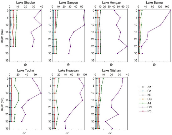 where Trn is the toxic-response factor of element n in the sediments, and the factors were 30 for Cd; 10 for As; 5 for Cu, Ni and Pb; 2 for Cr and 1 for Zn [32]. The Er giving an evaluation of single metal pollution was classified into five grades: low risk (Er ≤ 40), moderate risk (40 < Er ≤ 80), considerable risk (80 < Er ≤ 160), high risk (160 < Er ≤ 320) and very high risk (Er > 320).