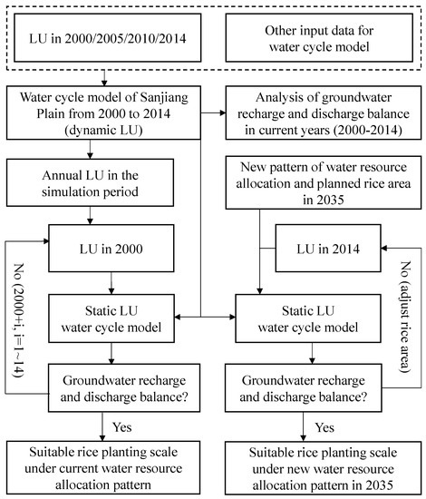 Using the land-use data of 2000, 2005, 2010, and 2014, we built a 2000~2014 water cycle model of the Sanjiang Plain under the dynamic land-use mode (baseline model), which has been calibrated and verified [21]. The baseline model was used to analyze groundwater balance in the Sanjiang Plain at the current rice planting scale. The current year’s groundwater is overexploited, indicating that the current rice planting area is not the appropriate rice planting scale in Sanjiang Plain. Based on the baseline model, the corresponding water cycle model under the static land-use mode was built using the annual land-use data (including land-use data interpolated by the baseline model) during the simulation period (static models). The appropriate rice planting scale under the current water resource allocation pattern was obtained by comparing the simulated groundwater balance from 15 static models. Sanjiang Plain actively carries out surface water engineering construction, increases the surface water utilization rate, and lowers reliance on groundwater to strengthen the water resource guarantee capacity and minimize the over-exploitation of groundwater. A new water resource allocation pattern will be established in 2035, by which time a larger rice planting scale will be used in the Sanjiang Plain. Based on the 2014 static model (the water cycle model built using the 2014 LU), we also built a prediction model by replacing its corresponding input data with the 2035 water allocation and rice area data [22], and simulated the groundwater recharge and discharge in the Sanjiang Plain. If the groundwater in plain areas does not reach a balance between recharge and discharge, rice areas will continue to be adjusted until the groundwater reaches a dynamic balance. This helps determine how much rice should be planted under the new pattern of water resource allocation. The technical scheme can be represented by the flow chart shown in Figure 2.