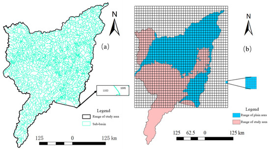 Unit division of the hydrological cycle and groundwater numerical simulation. (a) Sub-basins of the Sanjiangping; (b) groundwater grid cells in plain areas.