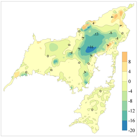 Variation of groundwater level from 2000 to 2014 in the plain areas. Negative values mean that the groundwater level drops (unit: m).